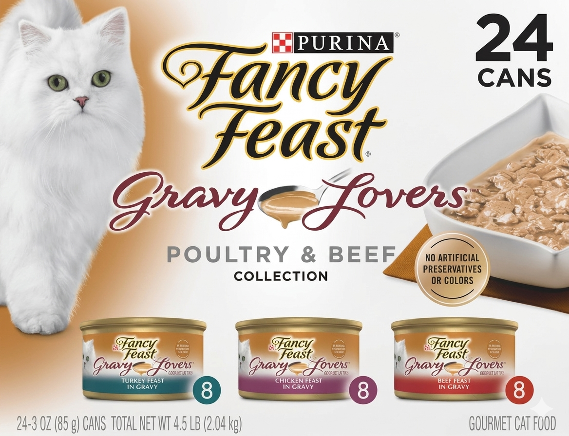An irresistible, protein-rich Fancy Feast Gravy Lovers cat food taste offering a gourmet turkey, chicken or beef cat food meal with an enticing aroma and a light, savory gravy