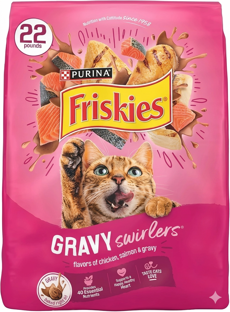 Complete Cat Food: Friskies Gravy Swirlers dry cat food delivers 100 percent complete and balanced nutrition.