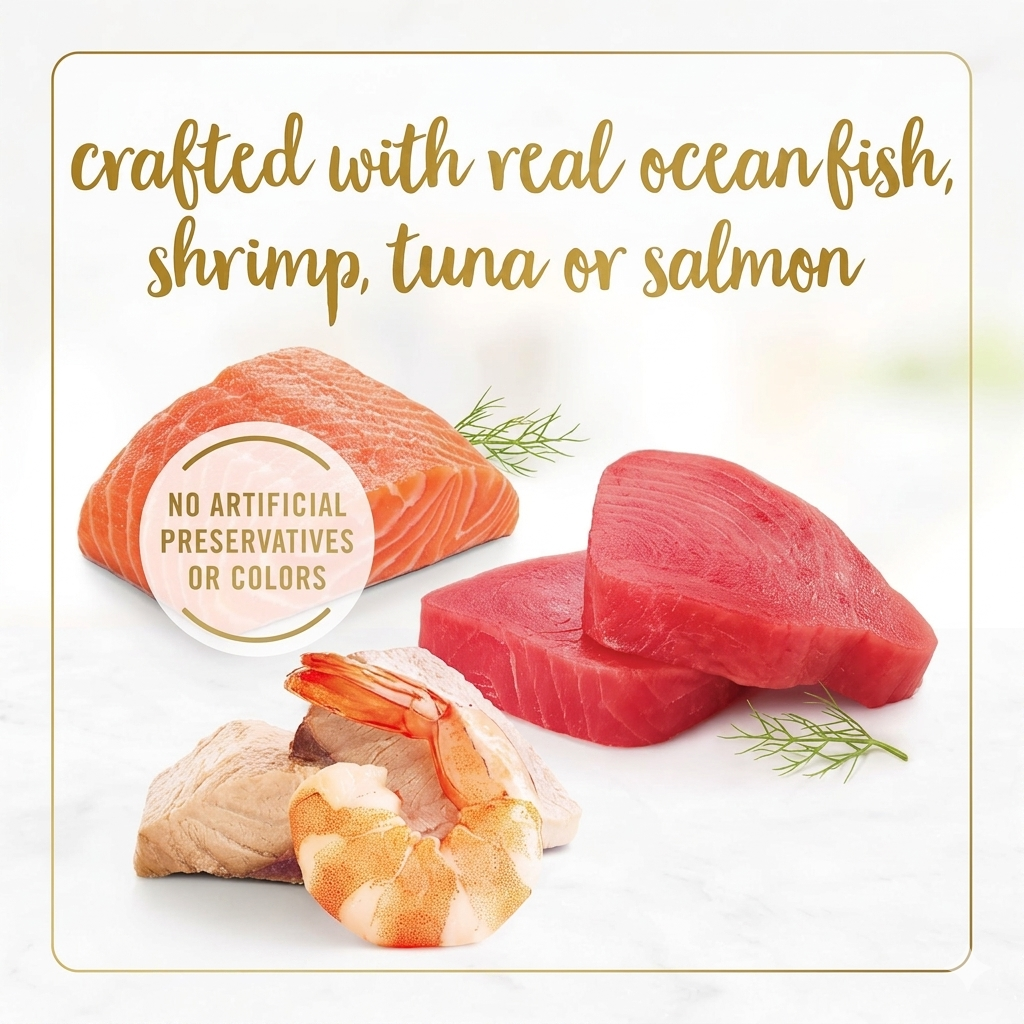 Make mealtime a memorable occasion when you serve Purina Fancy Feast Grilled Seafood Feast Collection wet cat food. Tender cuts of fish and seafood deliver the ocean flavors cats crave, and the tender texture of this soft cat food entices your cat to eat every scrumptious bite. Each recipe features a savory gravy that balances out these mouthwatering entrees, and high-quality ingredients provide an exceptional level of taste. With essential vitamins and minerals to support her overall health in every serving, this gourmet cat food lets you feel good about the meals you serve. Offer up a different recipe at every feeding to keep her interested in what’s being put in her dish, and let her delight in the rich flavors. She is sure to love the gourmet flavor combinations, and you can rest easy knowing she’s getting 100 percent complete and balanced nutrition for adult cats. Get her favorite soft cat food delivered with just a few mouse clicks when you order this Purina recipe from Amazon.com.