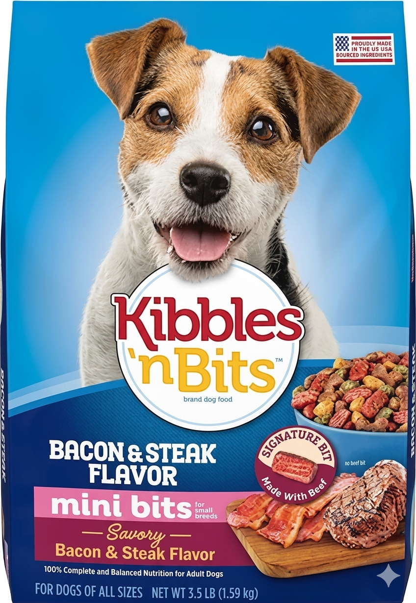 SMALL BREED DOG FOOD: One (1) 3.5 LB Bag of Kibbles ‘n Bits Mini Bits Small Breed Dry Dog Food offers a savory Bacon & Steak flavor, delivering maximum taste in every bite.