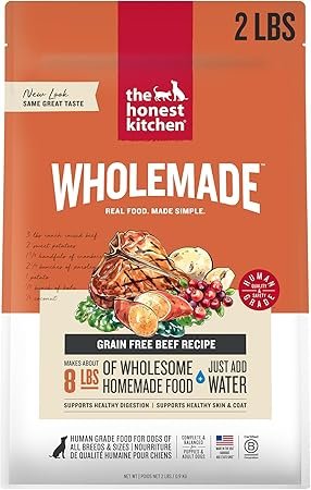 The Honest Kitchen’s Wholemade dehydrated foods concentrate the benefits of fresh, homemade meals real ingredients, minimal processing, and robust nutrition into a convenient, cost-effective form. 100% human grade and made with hiqh-quality ingredients you recognize, like ranch raised beef, sweet potato and parsley, just add warm water, wait 3 minutes, and watch your dogs tail wag with excitement. Serve as a complete meal, a nutritious topper or paired with your dog’s favorite enrichment toy.